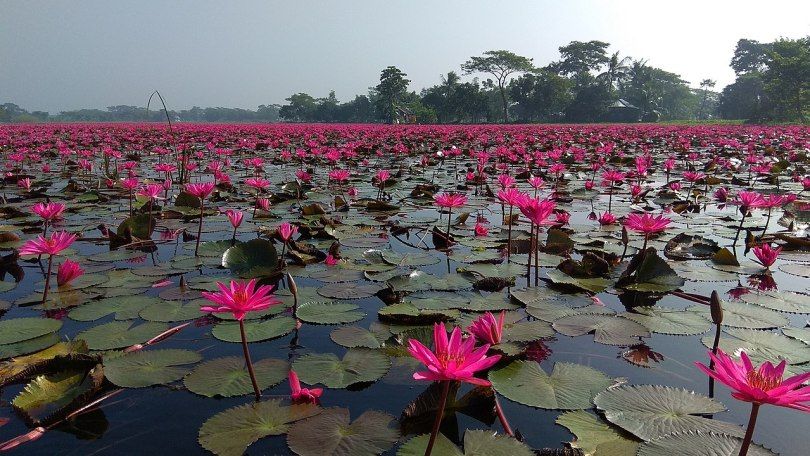 This is waterlily (shapla) season in the village of Satla, when the national flower of Bangladesh grows in abundance. The carpet of pink flowers blooms on the village canal and over 10,000 acres of village wetlands.