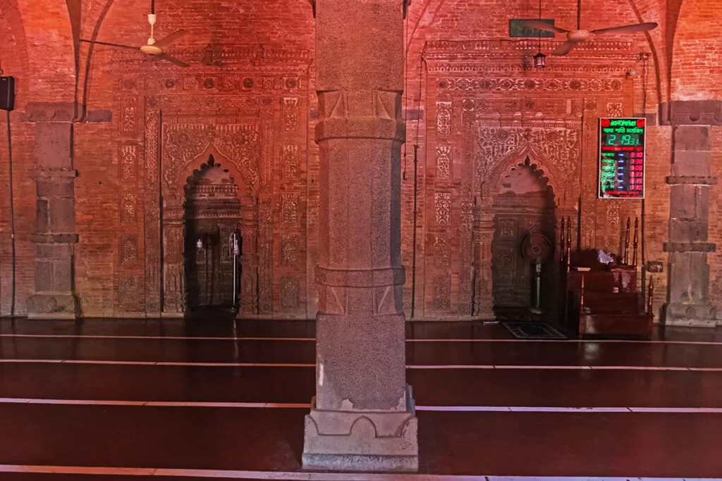 🔹 Brick Construction: Built primarily with baked red bricks, a hallmark of Sultanate architecture in Bengal where stone was scarce.