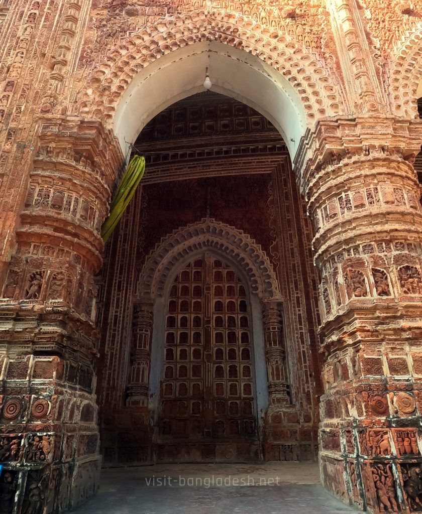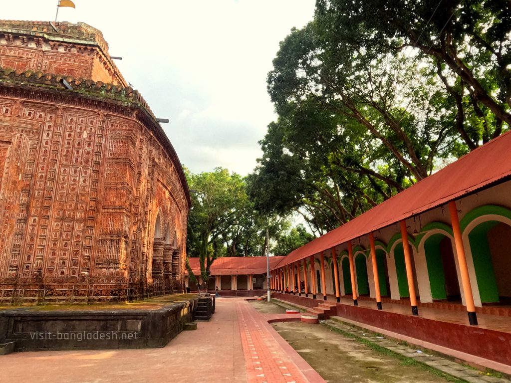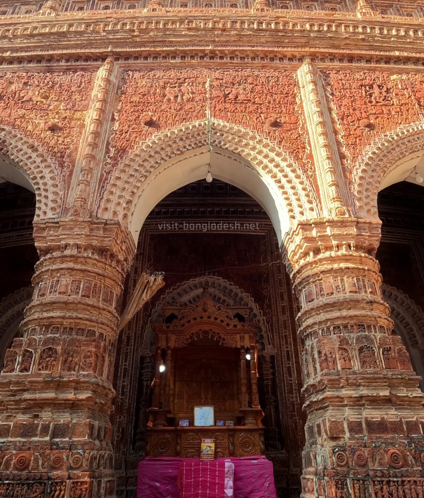 The temple seamlessly fuses Hindu temple architecture with elements from Mughal design, demonstrating the syncretic spirit of Bengal during that era.