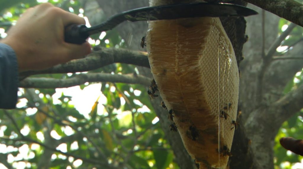 3) Smoking the Beehive: They use smoke to calm the bees before carefully cutting the honeycomb.