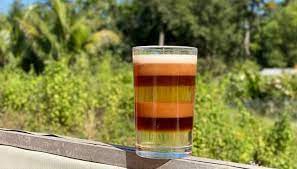 🔹 The result is a rainbow-like drink with beautifully separated layers from deep brown to golden yellow to greenish hues.