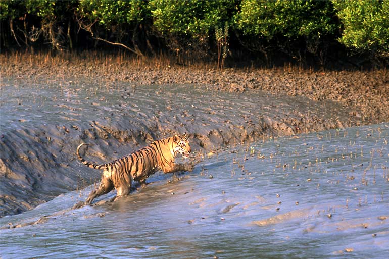 Climate in the Sundarbans is moderate. Air is humid. Full monsoon is from June to September. The annual rainfall average between 65″ and 70″. During ebb tide the forest becomes bare by 6-7 feet and at high tide (30 miles and hour) the entire territory of the forest floats on water.
